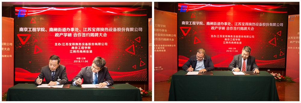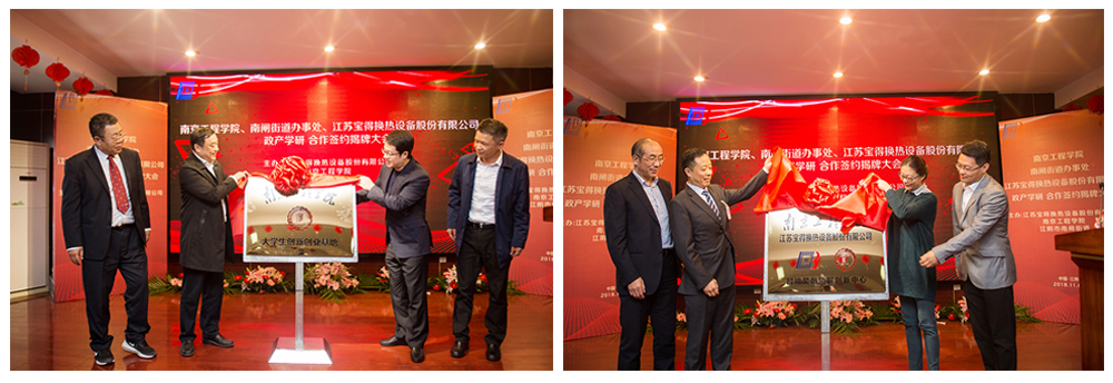 11月6日上午,od体育官网与江阴市南闸街道、江苏宝得换热设备股份有限公司政产学研合作签约揭牌仪式在宝得公司举行。