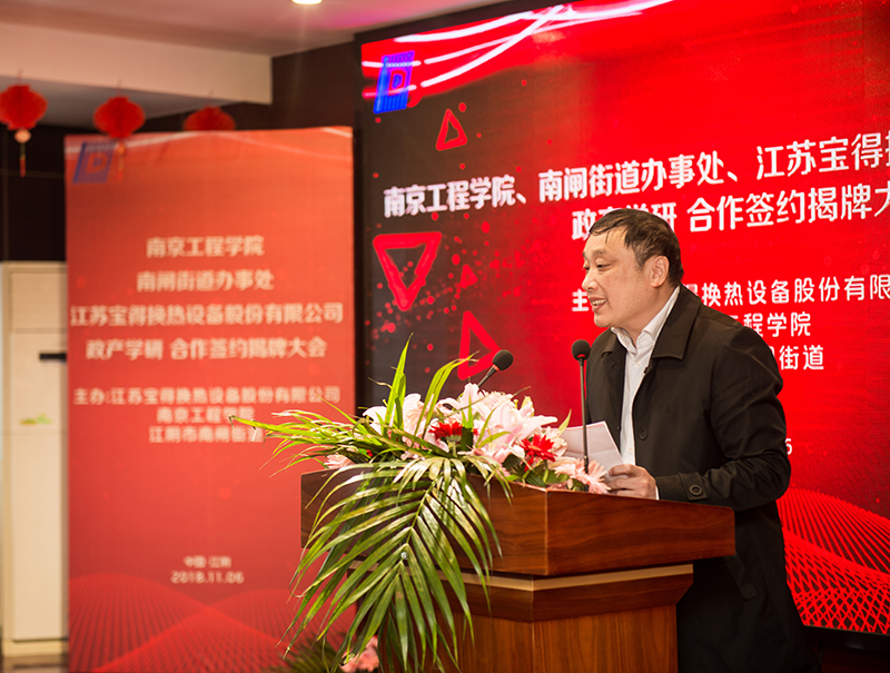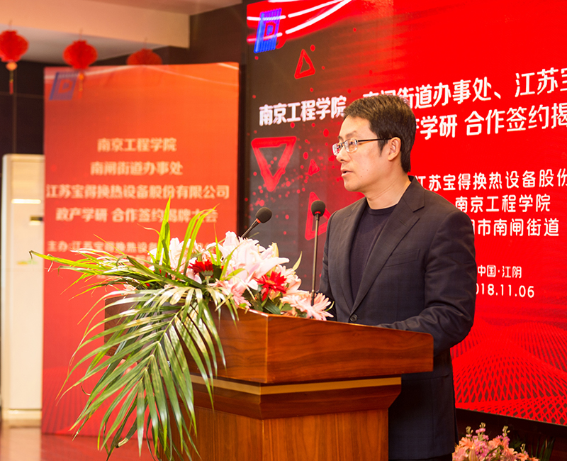 od体育官网史金飞院长,江阴市赵亮亮副市长,江阴市南闸街道党工委李志浩书记,江苏宝得换热设备股份有限公司奚龙董事长出席活动并讲话。江阴市科技局,宝得公司高管,南闸街道企业代表;od体育官网发展与对外合作处、科技与产业处,机械工程学院有关负责人参加了活动。