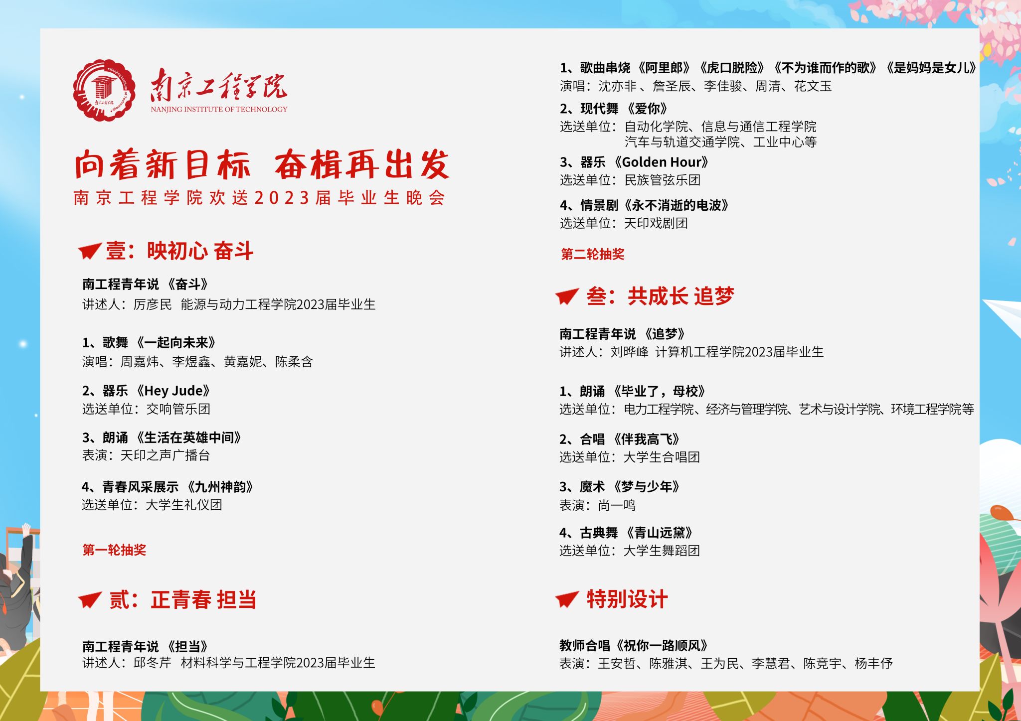 毕业季来临,为欢送2023届毕业生,表达母校对毕业生殷切的期望和美好的祝福,学校决定举办 “向着新目标,奋楫再出发”欢送2023届毕业生文艺晚会,现将有关安排通知如下: