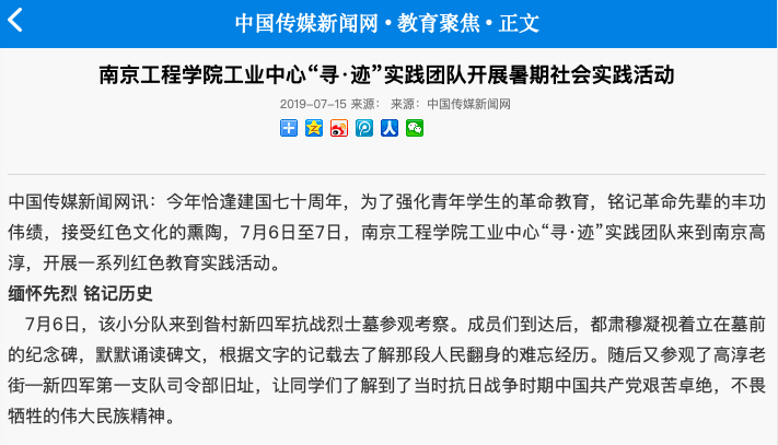 中国传媒新闻网讯:今年恰逢建国七十周年,为了强化青年学生的革命教育,铭记革命先辈的丰功伟绩,接受红色文化的熏陶,7月6日至7日,od体育网页登录入口工业中心“寻·迹”实践团队来到南京高淳,开展一系列红色教育实践活动。