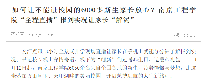 “我们在画面中看到已经有家长陆续来到了校门外,开始目送孩子进入校园,殷殷期盼与叮咛不舍我们通过画面已经感受到了。”“现在我们的新生正在使用校园app扫描二维码,确认身体无恙后即可进入校园。”“已经有同学乘坐上了一早就守候在这里的小公交,可以看到志愿者们正在帮忙搬运行李,小公交将把他们送至宿舍区……”新生报到首日上午,手机直播平台频频传来主播的声音,从入校到去宿舍送行李,再到学院走报到流程,数台摄像机、无人机零距离、全方位跟拍直播,让家长们感到直观又暖心。