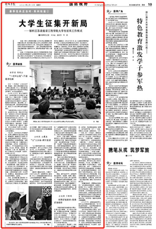 这是一个闪亮的品牌:因征兵工作和国防教育工作突出,该院多次被表彰为“全国国防教育特色学校”“江苏省学生军训工作先进单位”“江苏省征兵工作先进单位”等。该院先后迎来350余所高校征兵工作同行以及15个军分区(警备区)、120余个县(市、区)人武部领导前来参观“取经”,已成为江苏省高校征兵工作的一张闪亮名片。