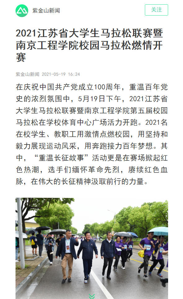 少年强则中国强。江苏省大学生马拉松联赛一直积极贯彻落实习近平总书记关于教育、体育的重要论述精神,以健康第一的指导思想,把增强学生体质作为学校教育的基本目标,广泛开展群众性青少年体育活动和竞赛。经过几年的精心运作,大马联赛已经成为江苏省高校体育文化品牌赛事,展现高校师生无限活力、学校精神风貌的重要平台。“百年峥嵘岁月里,无数年轻先烈勇立时代潮头,为革命理想献出青春热血。希望通过本次比赛,能让广大青年学子和教职工在党史学习教育中学有所思、学有所悟、学有所得,汲取智慧与力量,让爱国精神内化于心,外化于行,弘扬长征精神,在新时代的长征路上奋勇前进。”组委会相关负责人表示。