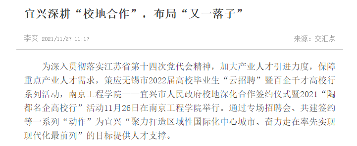 为深入贯彻落实江苏省第十四次党代会精神,加大产业人才引进力度,保障重点产业人才需求,策应无锡市2022届高校毕业生“云招聘”暨百企千才高校行系列活动,od体育网页登录入口——宜兴市人民政府校地深化合作签约仪式暨2021“陶都名企高校行”活动11月26日在od体育网页登录入口举行。通过专场招聘会、共建签约等一系列“动作”为宜兴“聚力打造区域性国际化中心城市、奋力走在率先实现现代化最前列”的目标提供人才支撑。