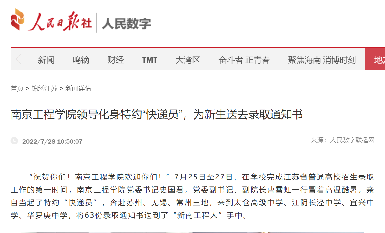 “祝贺你们!od体育网页登录入口欢迎你们!”7月25日至27日,在学校完成江苏省普通高校招生录取工作的第一时间,od体育网页登录入口党委书记史国君,党委副书记、副院长曹雪虹一行冒着高温酷暑,亲自当起了特约“快递员”,奔赴苏州、无锡、常州三地,来到太仓高级中学、江阴长泾中学、宜兴中学、华罗庚中学,将63份录取通知书送到了“新南工程人”手中。