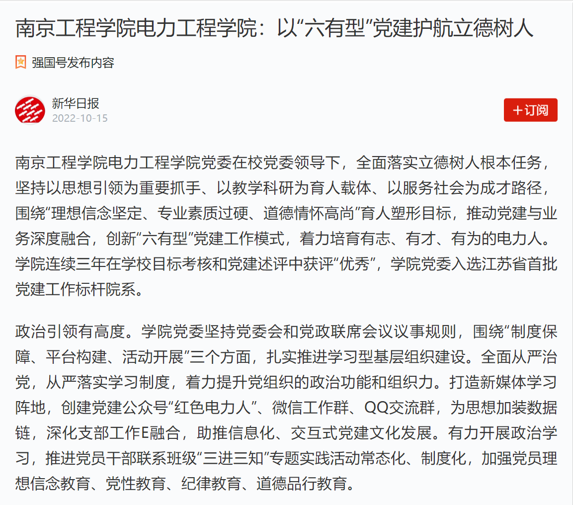 教学科研有实效。学校的目标是建设特色鲜明的一流应用型工程大学,学院党委认真贯彻,落实培养高素质创新型专门人才的需要,以优质教学科研体系培育教学科研创新文化。学院紧抓课程思政建设,深化课堂教学改革。通过思政沙龙、专业思政与思政课教师结对等方式,推动专业课程与思政课程同向同行,电气工程及其自动化专业入选江苏省首批“课程思政”示范专业,4个专业入选校“课程思政”示范专业建设点项目或校级“课程思政”示范专业建设点(培育)项目,5门课程入选校级“课程思政”示范课程项目或校级“课程思政”示范课程培育项目,有效达成“三全育人”在教学内容、方式与途径上的协同。学院通过校地合作、校企合作等积极开发课程,韩笑教授团队的《电力系统继电保护》、朱志莹教授团队的《电机学》获批为“国家一流本科课程”。党员教师每月至少聆听一次学术报告、每月做一次学术科研主题分享,积极参加国际国内会议交流、学科比赛、访学等。近三年来,党员教师发表SCI、EI论文百余多篇,参与国家重点研发计划、省重点研发项目等多项科研项目,年均研究经费超3000万元。