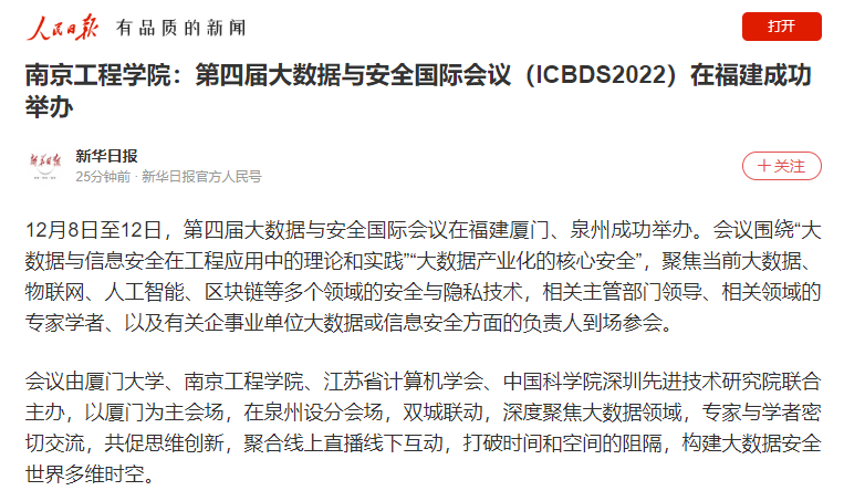 12月8日至12日,第四届大数据与安全国际会议在福建厦门、泉州成功举办。会议围绕“大数据与信息安全在工程应用中的理论和实践”“大数据产业化的核心安全”,聚焦当前大数据、物联网、人工智能、区块链等多个领域的安全与隐私技术,相关主管部门领导、相关领域的专家学者、以及有关企事业单位大数据或信息安全方面的负责人到场参会。