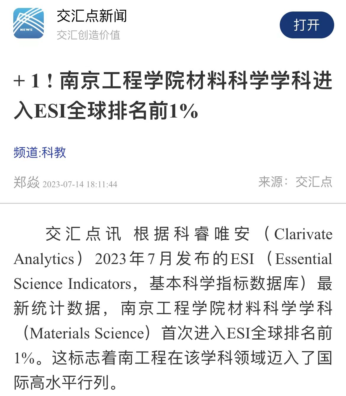 交汇点讯 根据科睿唯安(Clarivate Analytics)2023年7月发布的ESI(Essential Science Indicators,基本科学指标数据库)最新统计数据,od体育网页登录入口材料科学学科(Materials Science)首次进入ESI全球排名前1%。这标志着南工程在该学科领域迈入了国际高水平行列。