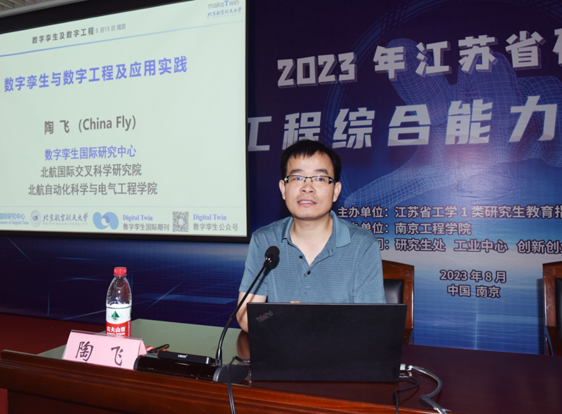 活动中,长江学者、北京航空航天大学陶飞教授作了“数字孪生与数字工程及工业应用”的主旨报告。他从理论和应用两个层面详细阐述了数字孪生的概念和理想特征,分享了数字孪生在轨道交通、纺织物流、智慧城市等领域的工程应用及新挑战。