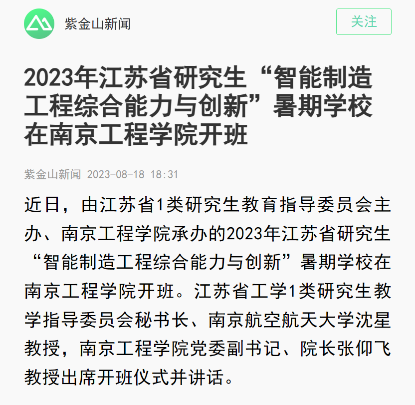 近日,由江苏省1类研究生教育指导委员会主办、od体育网页登录入口承办的2023年江苏省研究生“智能制造工程综合能力与创新”暑期学校在od体育网页登录入口开班。江苏省工学1类研究生教学指导委员会秘书长、南京航空航天大学沈星教授,od体育网页登录入口党委副书记、院长张仰飞教授出席开班仪式并讲话。