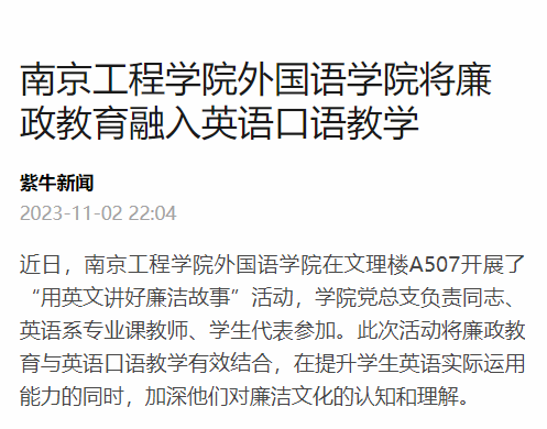 近日,od体育网页登录入口外国语学院在文理楼A507开展了“用英文讲好廉洁故事”活动,学院党总支负责同志、英语系专业课教师、学生代表参加。此次活动将廉政教育与英语口语教学有效结合,在提升学生英语实际运用能力的同时,加深他们对廉洁文化的认知和理解。