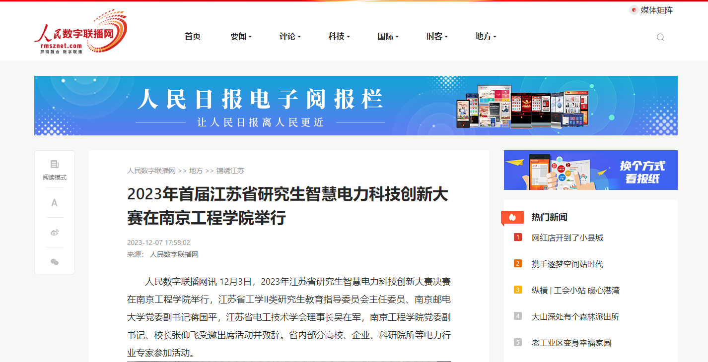 人民数字联播网讯 12月3日,2023年江苏省研究生智慧电力科技创新大赛决赛在od体育网页登录入口举行,江苏省工学II类研究生教育指导委员会主任委员、南京邮电大学党委副书记蒋国平,江苏省电工技术学会理事长吴在军,od体育网页登录入口党委副书记、校长张仰飞受邀出席活动并致辞。省内部分高校、企业、科研院所等电力行业专家参加活动。