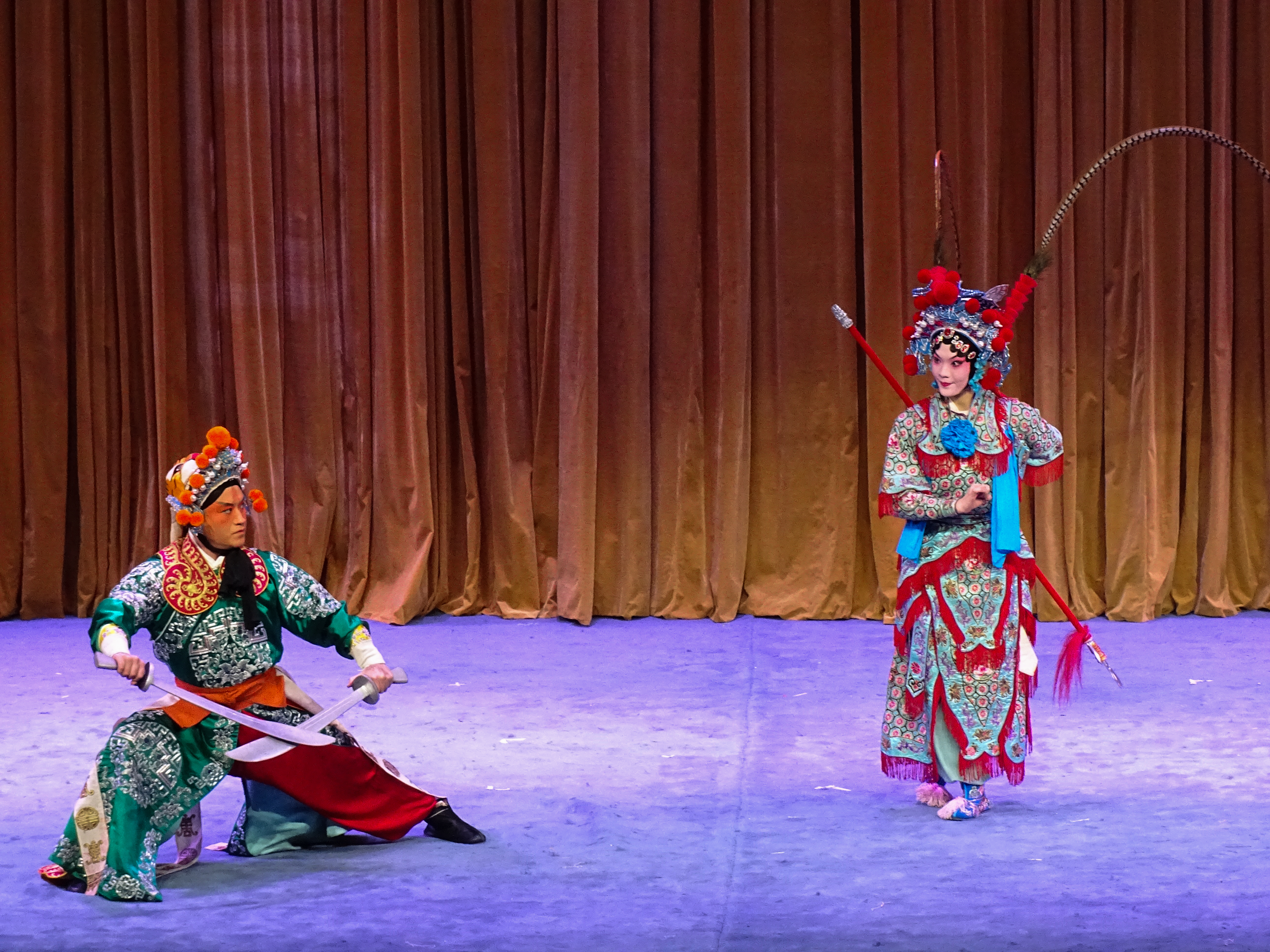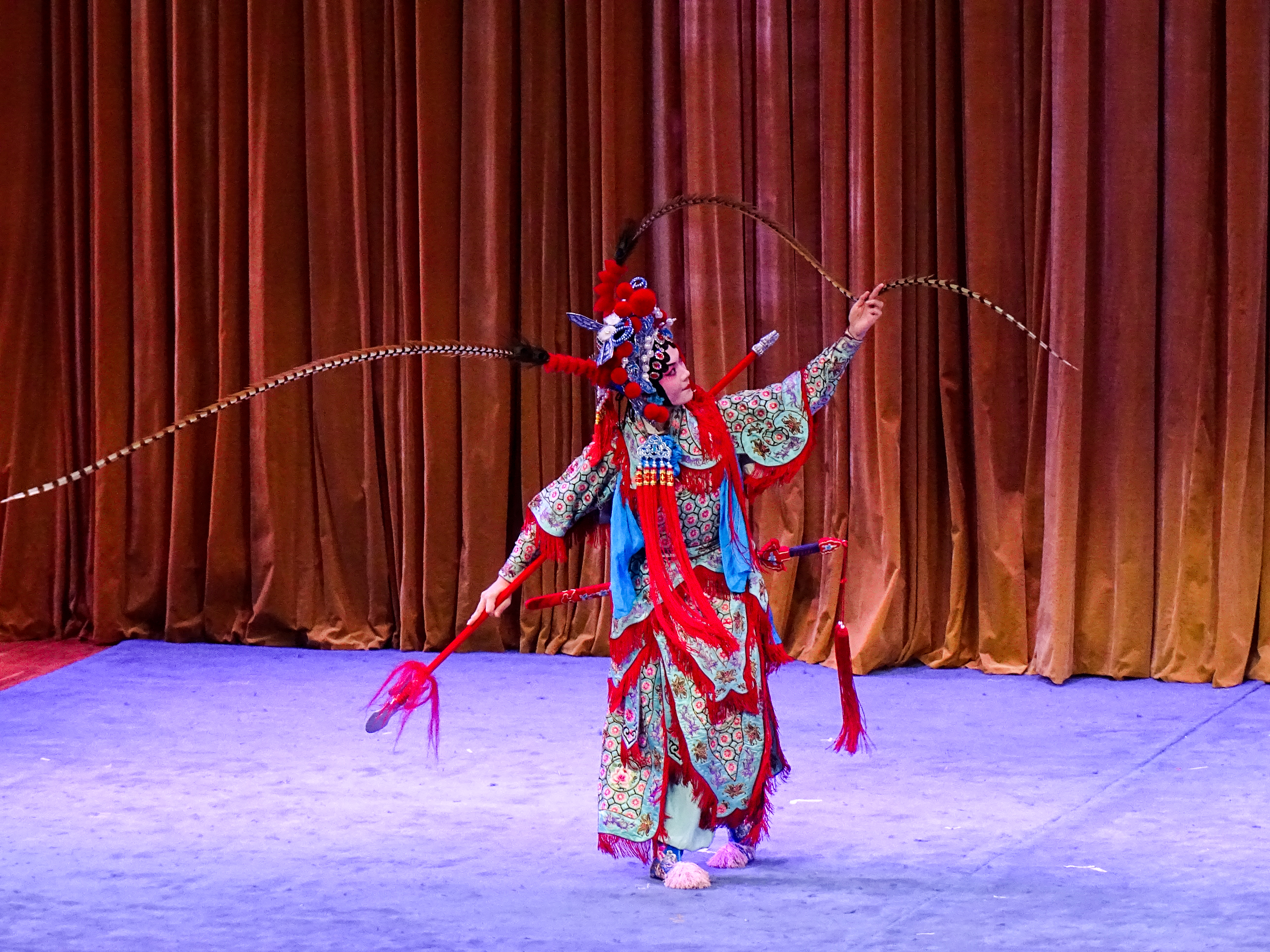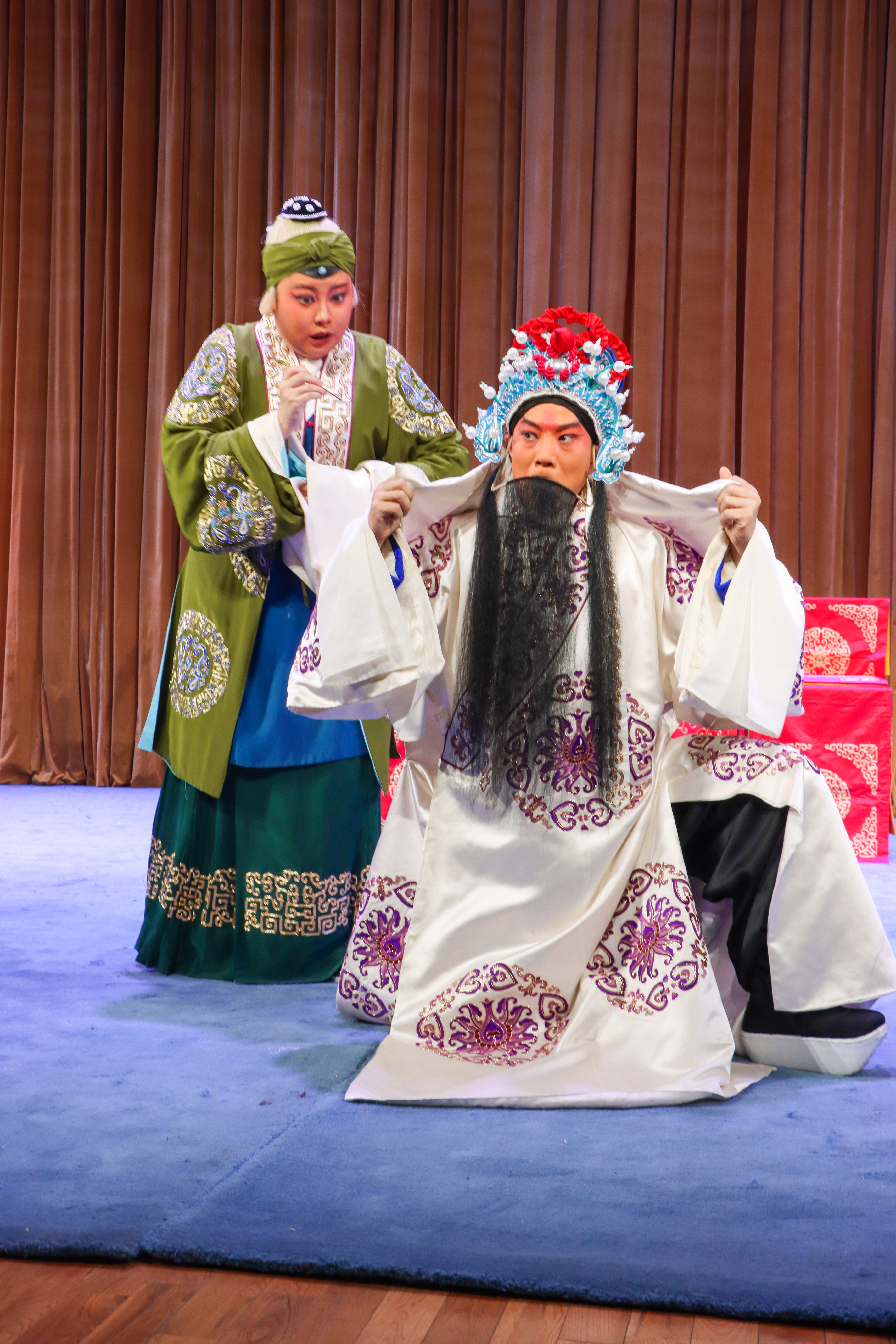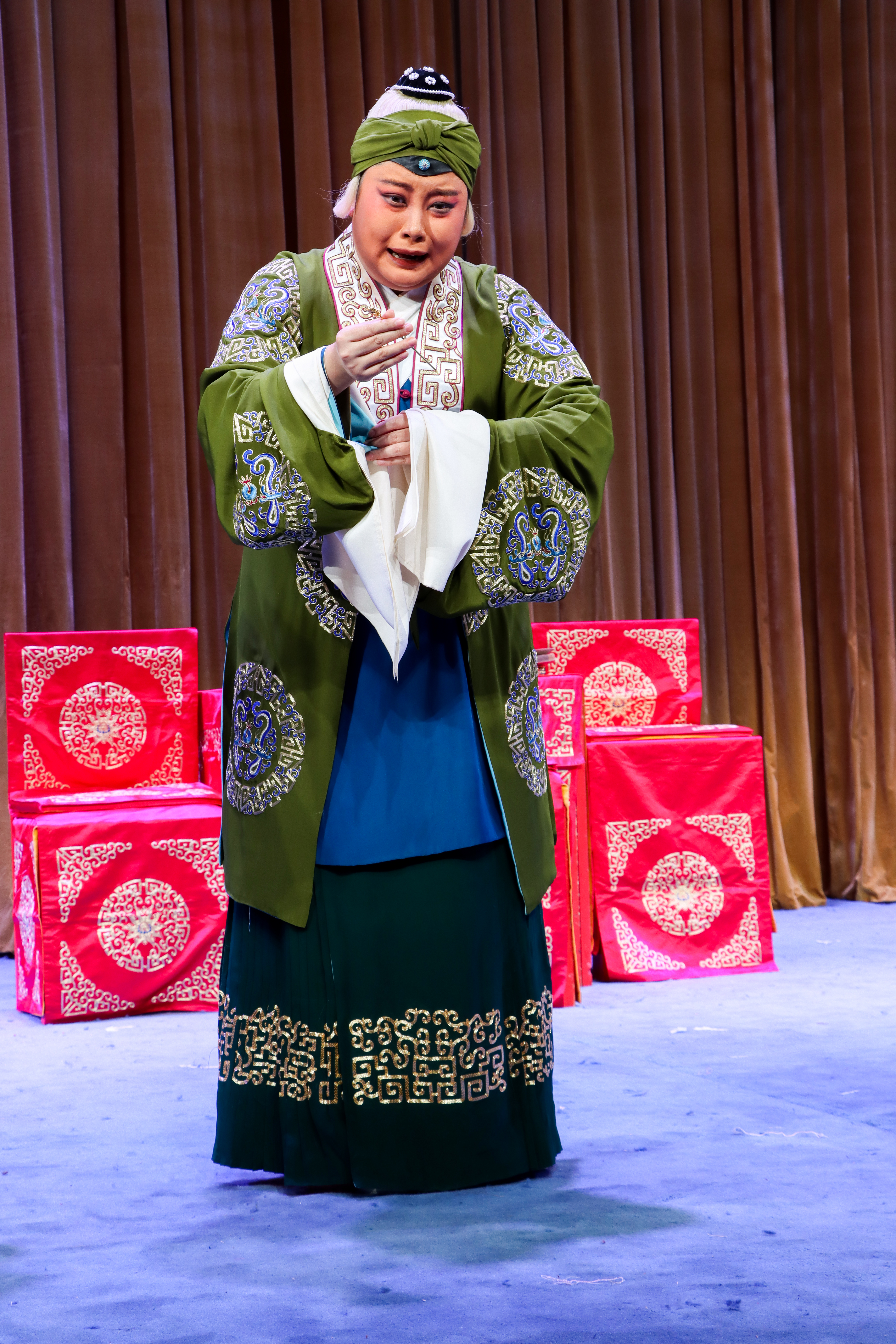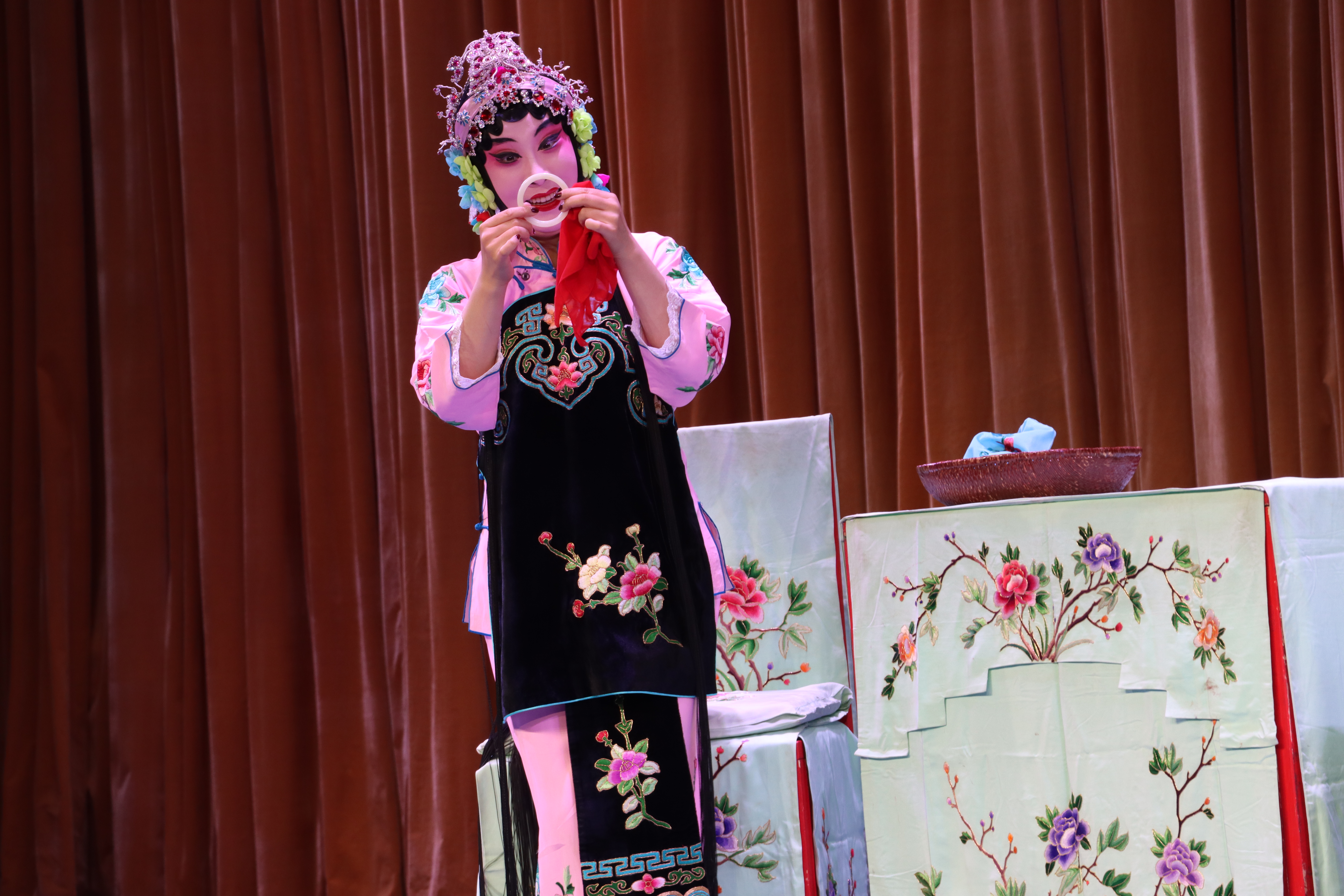 压轴戏是折子戏《岳母刺字》,讲述宋金交战时,抗金名将岳飞因主将杜充主和,愤而归家,意欲在家侍奉老母。岳母激励岳飞应以国家大局为重,并用金针在岳飞背上刺下“精忠报国”四个大字,激励他前往沙场杀敌报国,赶走侵略者。岳母的深明大义,岳飞的赤诚为国,岳夫人的默默付出,感染了每一位观众。“含悲忍泪狠心肠,一笔一画刺背上,刺在儿身娘心伤,我的儿忍痛无话讲。点点血墨染衣裳,刺罢了四字我心神恍,精忠报国字字辉煌 ……”饰演岳母的演员董源唱腔高亢,穿透力强,深深震撼人心。