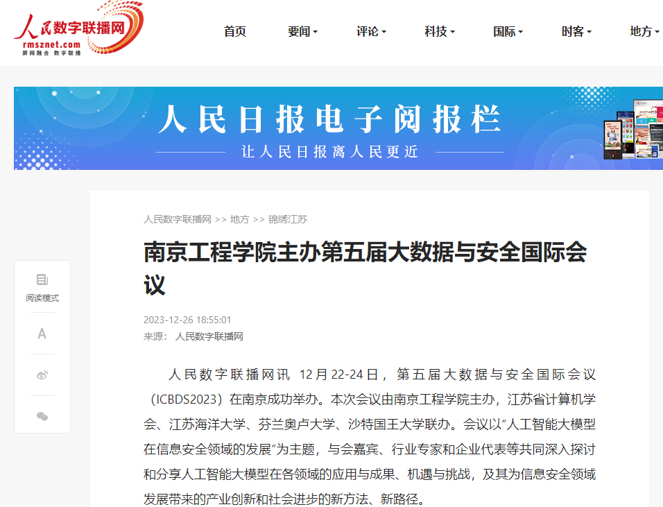 人民数字联播网讯 12月22-24日,第五届大数据与安全国际会议(ICBDS2023)在南京成功举办。本次会议由od体育网页登录入口主办,江苏省计算机学会、江苏海洋大学、芬兰奥卢大学、沙特国王大学联办。会议以“人工智能大模型在信息安全领域的发展”为主题,与会嘉宾、行业专家和企业代表等共同深入探讨和分享人工智能大模型在各领域的应用与成果、机遇与挑战,及其为信息安全领域发展带来的产业创新和社会进步的新方法、新路径。