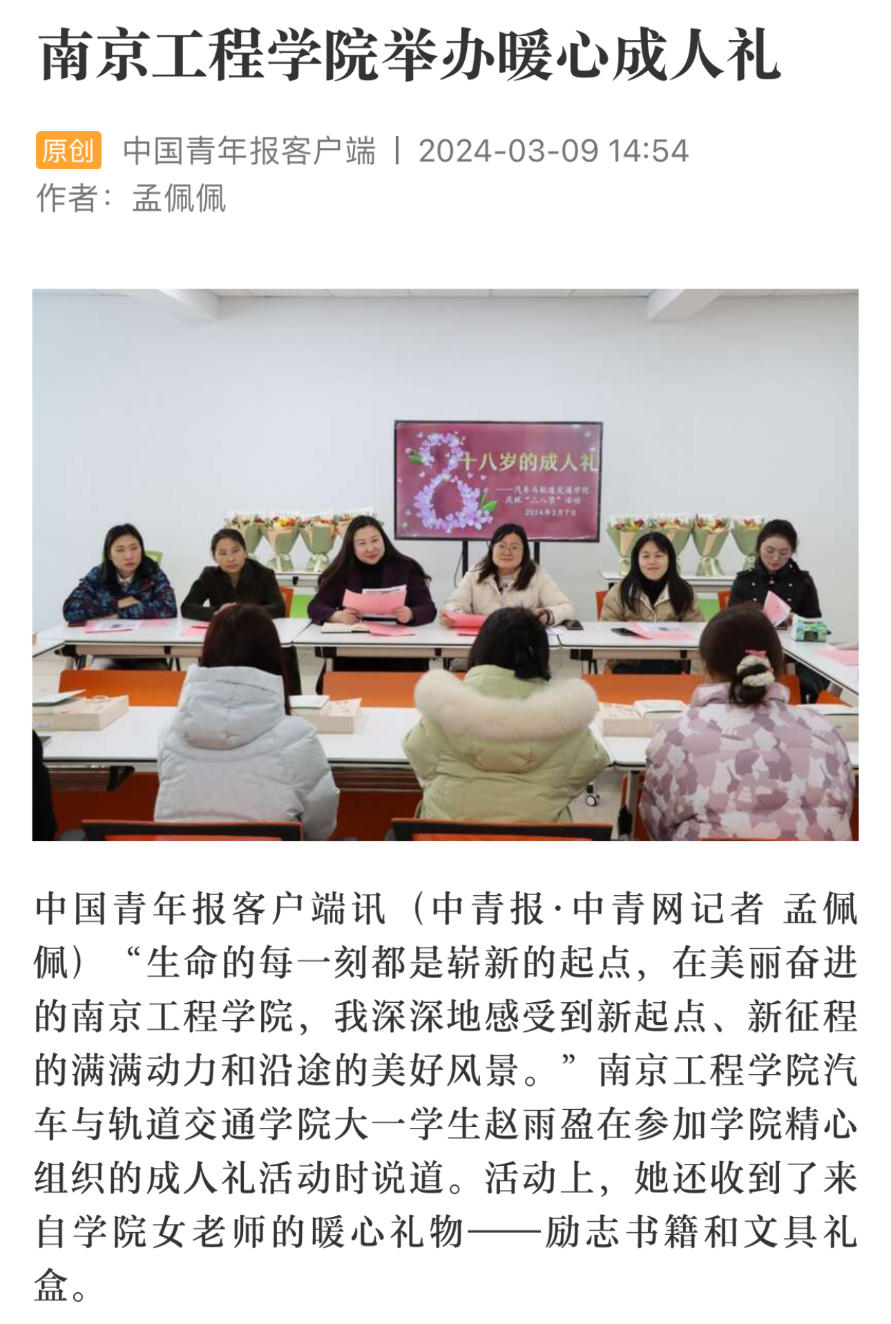中国青年报客户端讯(中青报·中青网记者 孟佩佩)“生命的每一刻都是崭新的起点,在美丽奋进的od体育网页登录入口,我深深地感受到新起点、新征程的满满动力和沿途的美好风景。”od体育网页登录入口汽车与轨道交通学院大一学生赵雨盈在参加学院精心组织的成人礼活动时说道。活动上,她还收到了来自学院女老师的暖心礼物——励志书籍和文具礼盒。