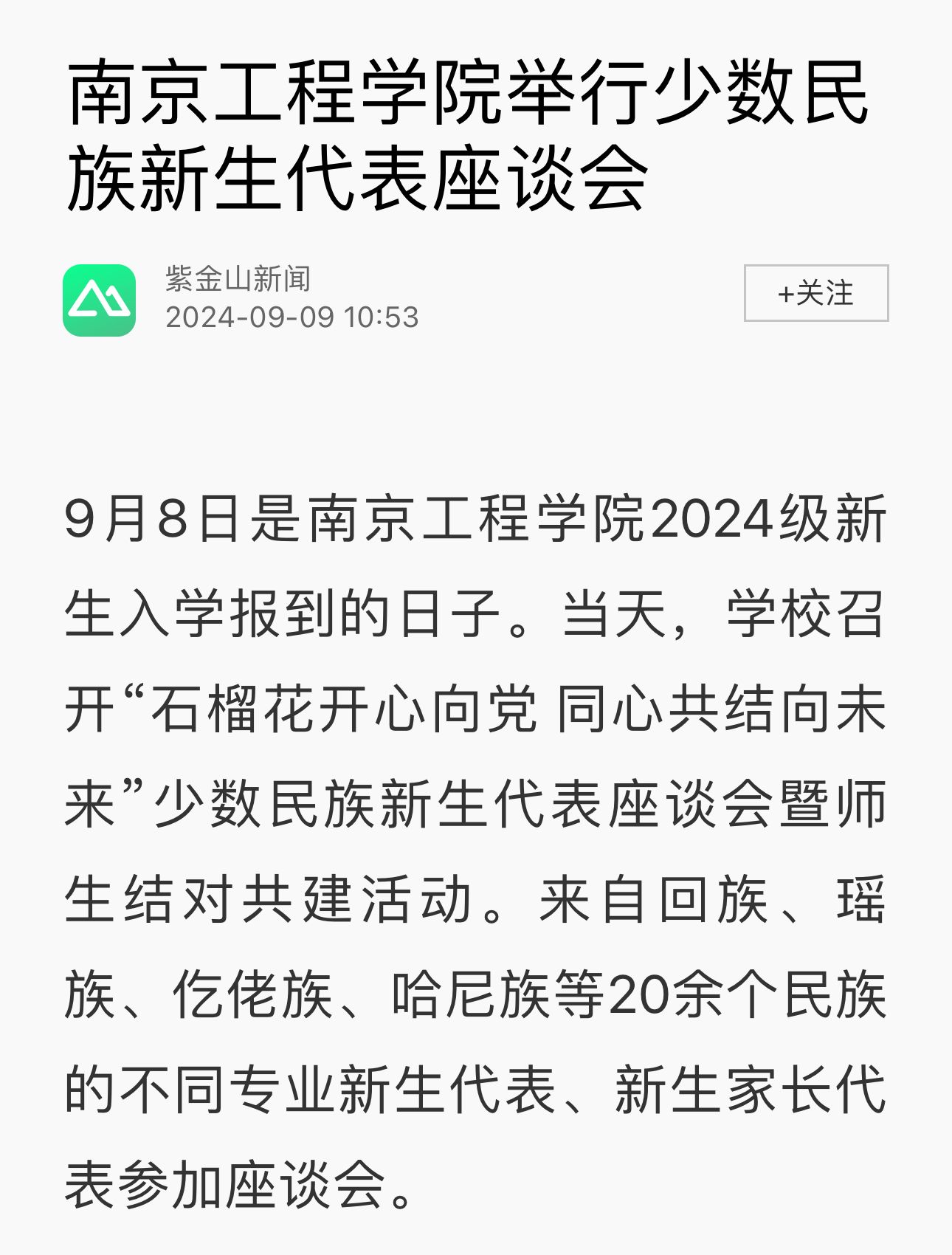 据介绍,学校现有来自贵州、江苏、内蒙等26个省市自治区的少数民族师生近900人。在新生入学当天举办少数民族新生座谈会,交流思想、统一认识,是学校扎实做好少数民族学生教育管理服务工作的一项创新举措,也是真诚关心爱护少数民族学生的具体表现。今后,学校将持续做好少数民族学生的教育、管理和帮扶,铸牢中华民族共同体意识,帮助少数民族学生成长成才,促进各民族学生交往交流交融。