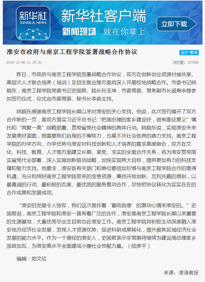 “淮安的发展令人惊叹,我们这次是怀着‘喜结良缘’的激动心情来淮安的。”史国君说,od体育网页登录入口和淮安一直有着广泛的合作,淮安是od体育网页登录入口长期以来重要的生源基地,大量优秀毕业生目前也在淮安工作。od体育网页登录入口将积极主动深度融入淮安地方经济社会发展,发挥人才资源优势、促进科研成果转化,提升服务区域经济社会发展的能力水平。作为一个曾经的淮安人,史国君表示非常期待继续为建设周总理家乡添砖加瓦,为淮安高水平全面建成小康社会贡献力量。(陆彦平)