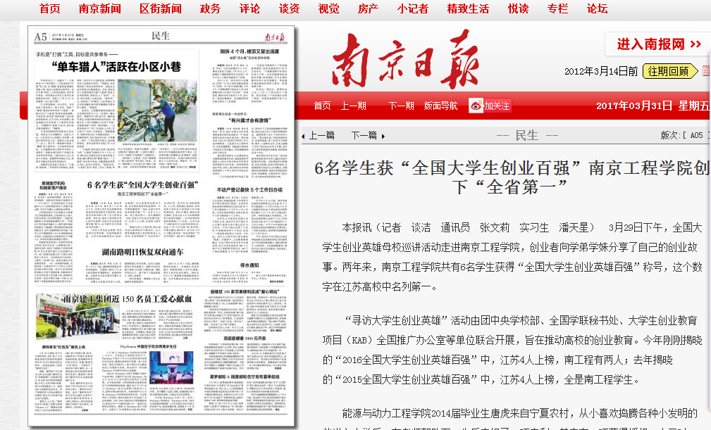 “寻访大学生创业英雄”活动由团中央学校部、全国学联秘书处、大学生创业教育项目(KAB)全国推广办公室等单位联合开展,旨在推动高校的创业教育。今年刚刚揭晓的“2016全国大学生创业英雄百强”中,江苏4人上榜,南工程有两人;去年揭晓的“2015全国大学生创业英雄百强”中,江苏4人上榜,全是南工程学生。